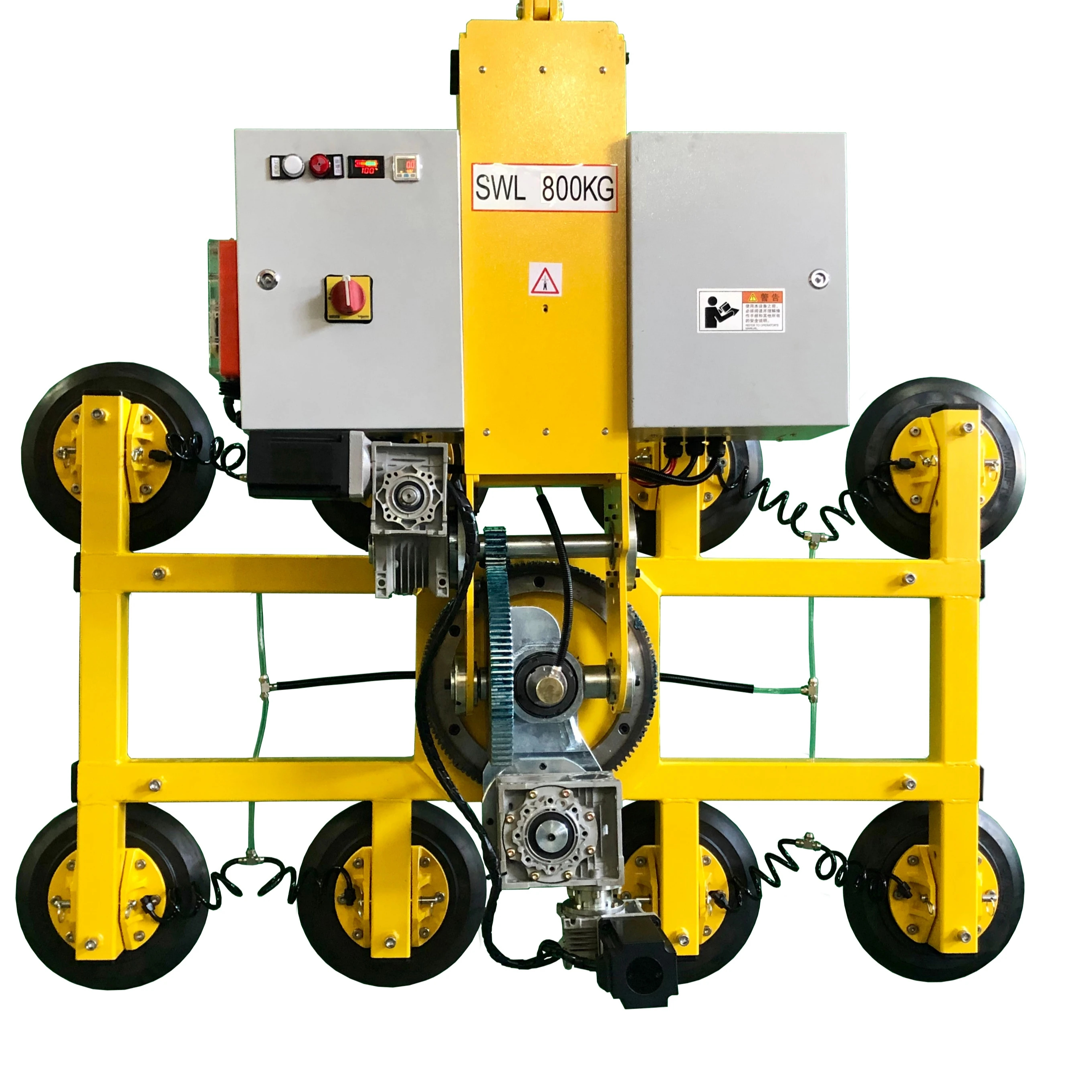 Product features: three-section splicing of equipment, suitable for glass hoisting of different sizes and outdoor curtain wall installation; high-precision motor and high-strength gear structure realize glass 0-90° electric flip, 0-360 electric rotation,wireless remote control operation,